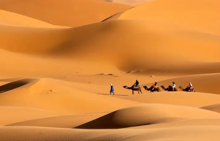 Een bezoek aan de Sahara is een onvergetelijke ervaring. Vanuit Merzouga trek je met een kameel de zandduinen van Erg Chebbi in en overnacht je in een traditioneel woestijnkamp onder een sterrenhemel. De stilte, de uitgestrektheid en de bijzondere sfeer maken dit tot een magisch hoogtepunt van je reis door Marokko.